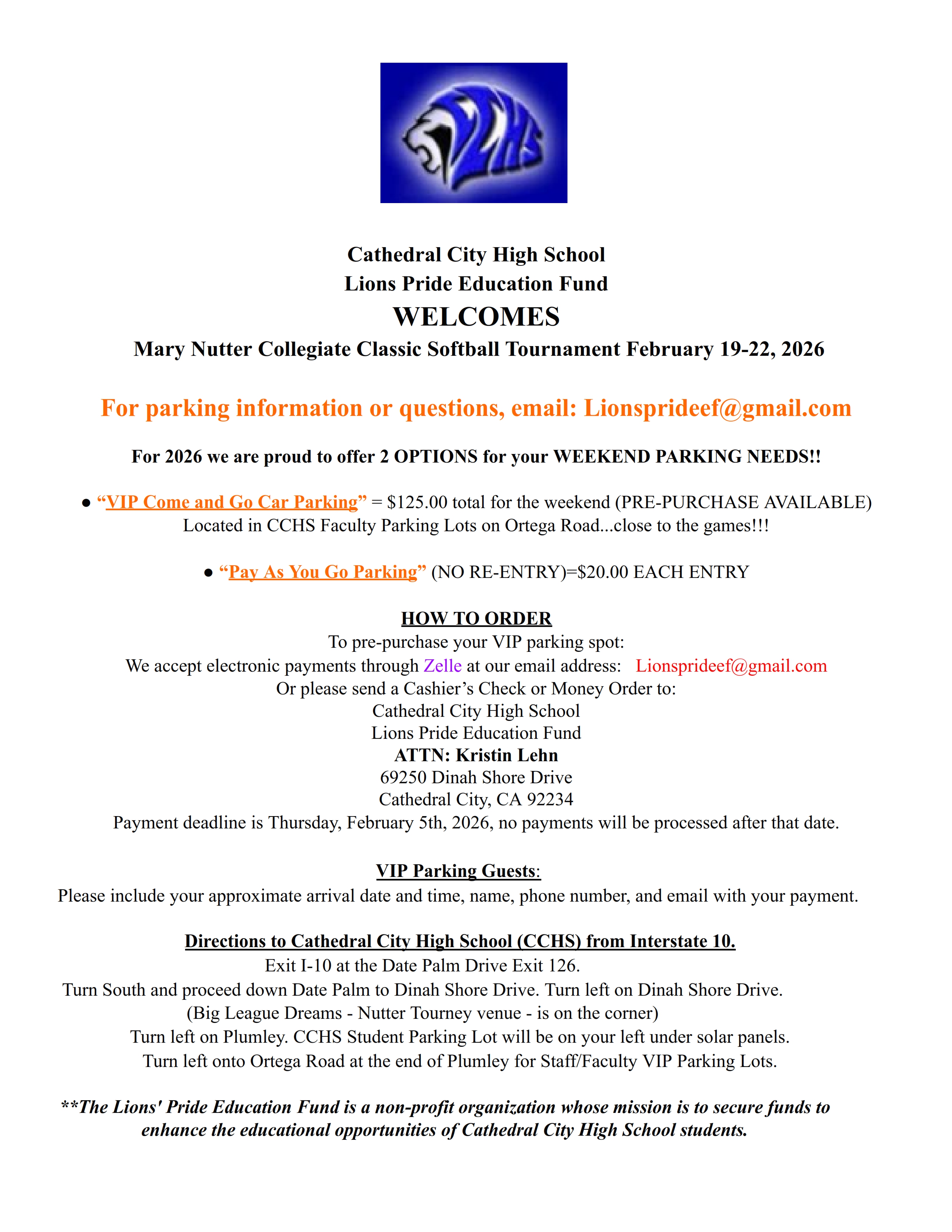 **The Lions’ Pride Education Fund is a non-profit organization whose mission is to secure funds to enhance the educational opportunities of Cathedral City High School students that other sources of revenue do not already provide.